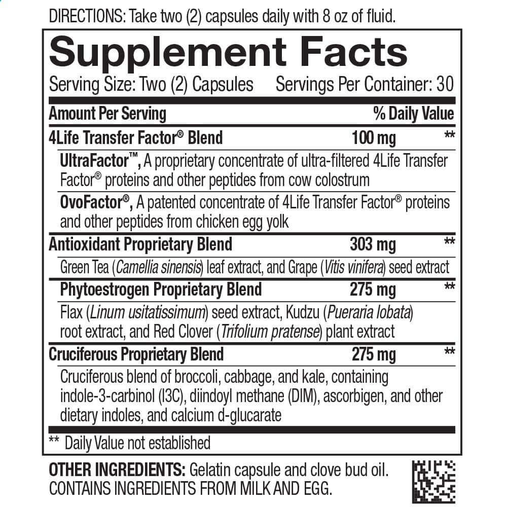 Celebrate your womanhood! 4Life Transfer Factor Belle Vie promotes healthy hormone balance, reproductive health, and breast health. A potent and proprietary phytoestrogen blend of kudzu, flax, and red clover phytoestrogen supports endocrine system health and healthy cellular function, while green tea and grape seed extract offer antioxidant support. Plus, it contains 4Life Transfer Factor® to educate and enhance the immune system. Take two (2) capsules per day to support female reproductive and breast health.*