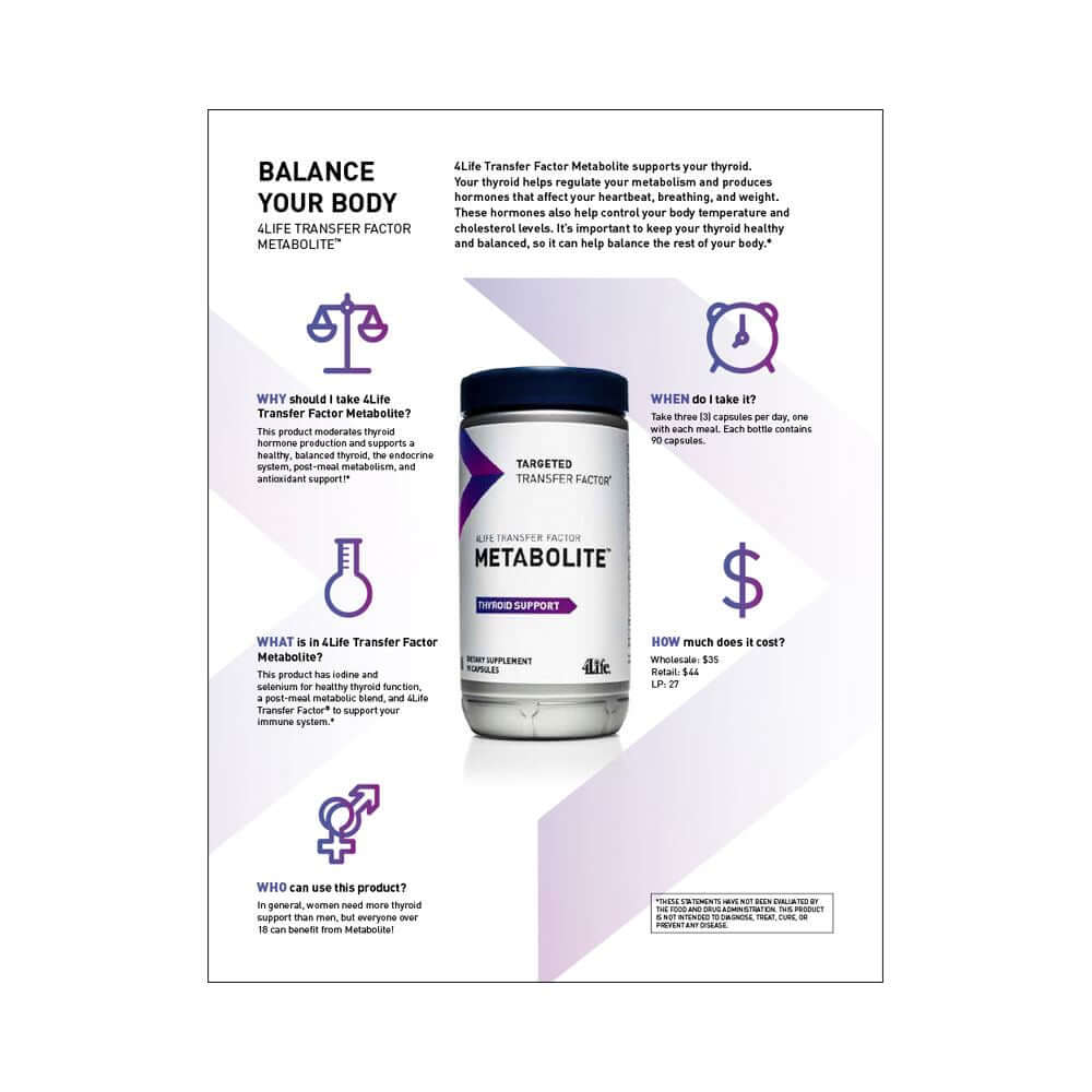 4Life Transfer Factor Metabolite combines well-researched ingredients to support optimal thyroid function, post meal metabolism, thyroid hormone activation, and the immune system with 4Life Transfer Factor®. Balance your body with 4Life Transfer Factor Metabolite!*