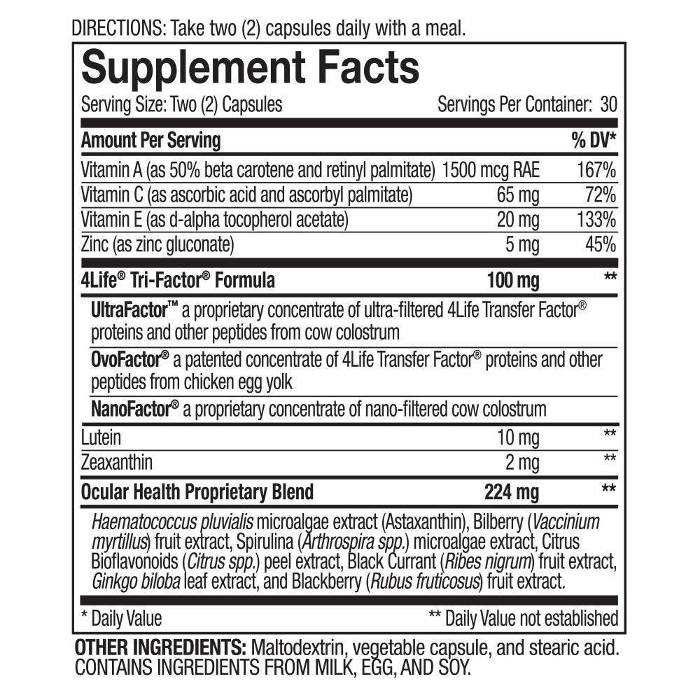 Made for details.™ 4Life Transfer Factor Vista provides targeted support for visual performance and eye health so you don’t miss out on the little things that make life beautiful. Vista contains the No. 1 doctor-recommended lutein brand, which acts as a critical shield to the eye’s macula region and provides antioxidant benefits. Other important antioxidants like bilberry and black currant extracts support healthy visual acuity and sharpness. Vista also features 4Life Transfer Factor® to educate and enhance the immune system, and Vitamins A, C, and E for additional support against free radicals. Take two (2) capsules daily to provide critical nutrients for optimal eye health.*